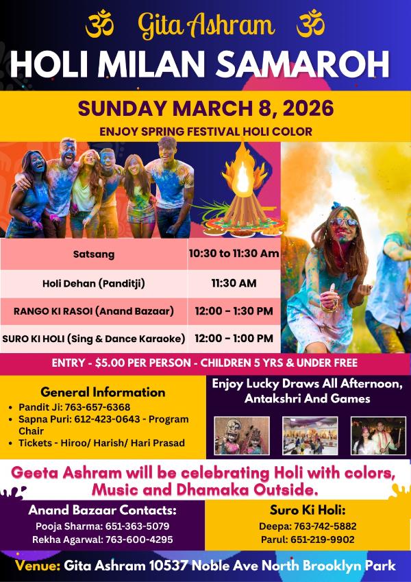 Dear Friends and Lovers of Holi - Festival of Colors: You are cordially invited to participate in MN Open-Air (outdoor) celebrations in Milan Courtyard on Saturday, March 14th, 1pm to 5pm. Please wear your dancing shoes and come dance to Bo