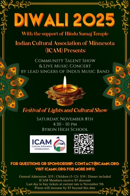 Join the Indian Cultural Association of Minnesota for a vibrant evening of lights, music, dance, and tradition at our Diwali Cultural Program in Rochester, MN!