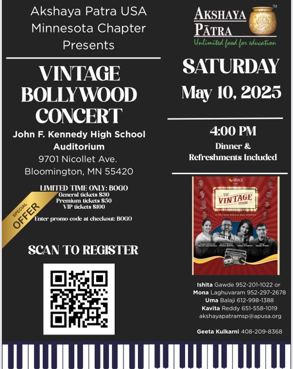 BOGO ALERT! ? Buy one ticket, get one FREE to our Mother's Day Vintage Bollywood Concert on Saturday, May 10th @4 PM onwards at John F Kennedy High School, Bloomington, MN.! ?? And, enjoy a delicious dinner included with your ticket purchase! ? Support a great cause while experiencing an unforgettable night of music and cuisine!