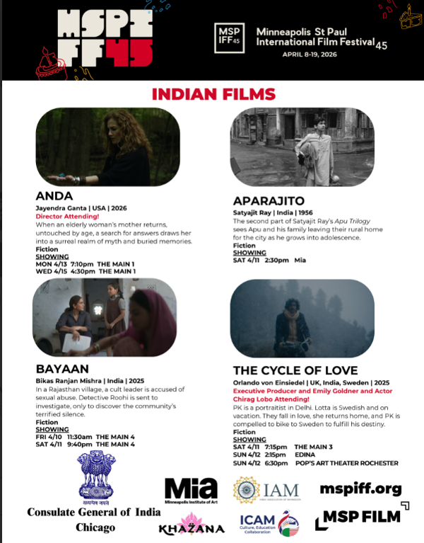 India Association of Minnesota (IAM), Minneapolis Institute of Art (Mia) and ICAM Rochester are partnering for the second year with MSPFS for its 45th year of the International Film Festival in the Twin Cities.
