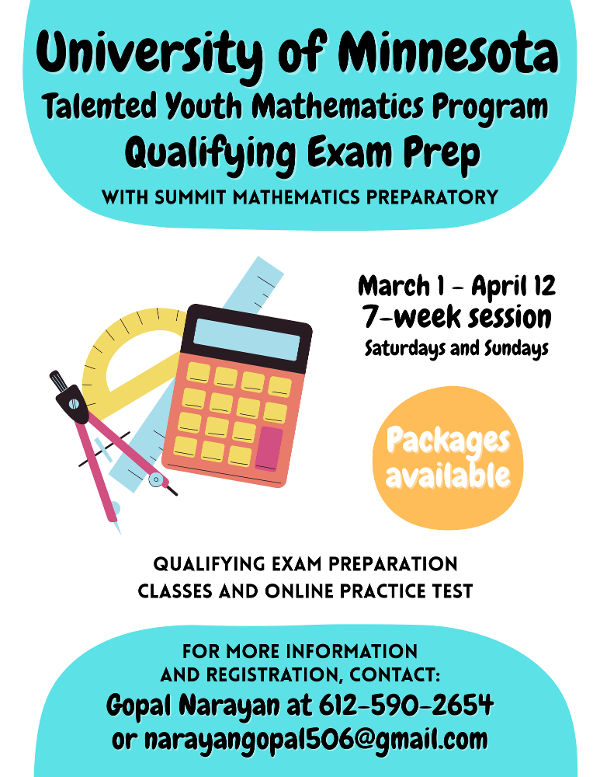 UMTYMP oreperatory classes will be offered from March 1 to April 12th (7-week program), taught by an experienced Mathematics Professor.