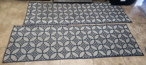 Set of two rugs with beautiful pattern, anti skit, in a good condition. Perfect for kitchen, hall area, dining area entry area of house. Immediate move out sale. Must go by Nov mid.